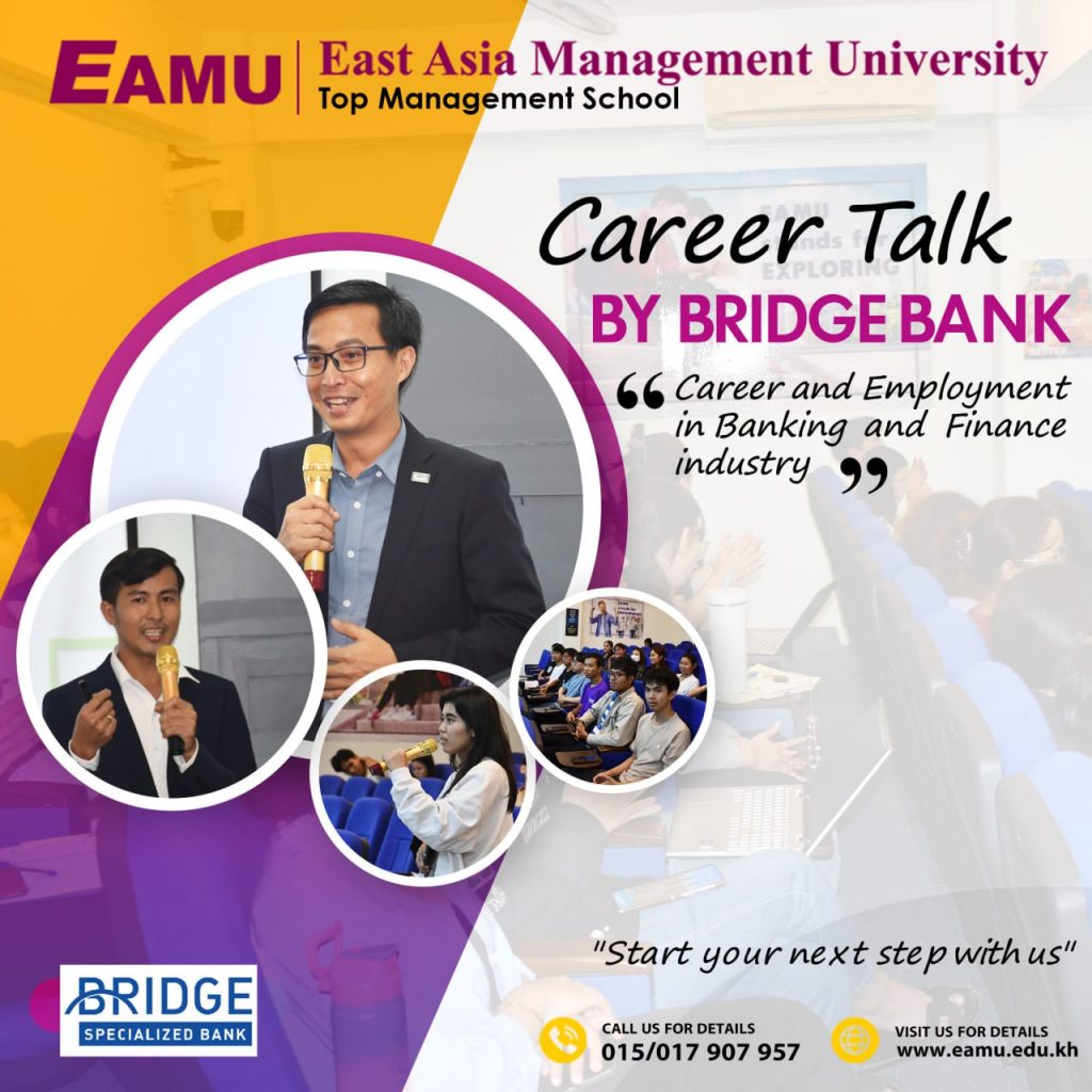 East Asia Management University (EAMU) was pleased to welcome Bridge Bank to campus for an informative career talk on opportunities in the banking and finance industry. The session provided students with valuable insights into career paths, industry expectations, and the skills required to succeed in the financial sector. Location: East Asia Management University (EAMU), Phnom Penh As an international university offering a global curriculum, EAMU ensures that our graduates are well-prepared for employment in international financial institutions, including Bridge Bank, to serve both local and overseas markets. About Bridge Bank: Owned by Oxley Holdings (Singapore) and the WorldBridge Group (Cambodia), Bridge Bank has experienced rapid growth since its inception. The bank provides a wide range of financial products and services to sectors including: Logistics Property and construction Special economic zones Food & beverage Trading and financial services Cash-in-transit Business process outsourcing Media & entertainment EAMU thanks Bridge Bank for sharing their expertise and looks forward to continued collaboration to support students’ professional development and career readiness in the dynamic world of finance.