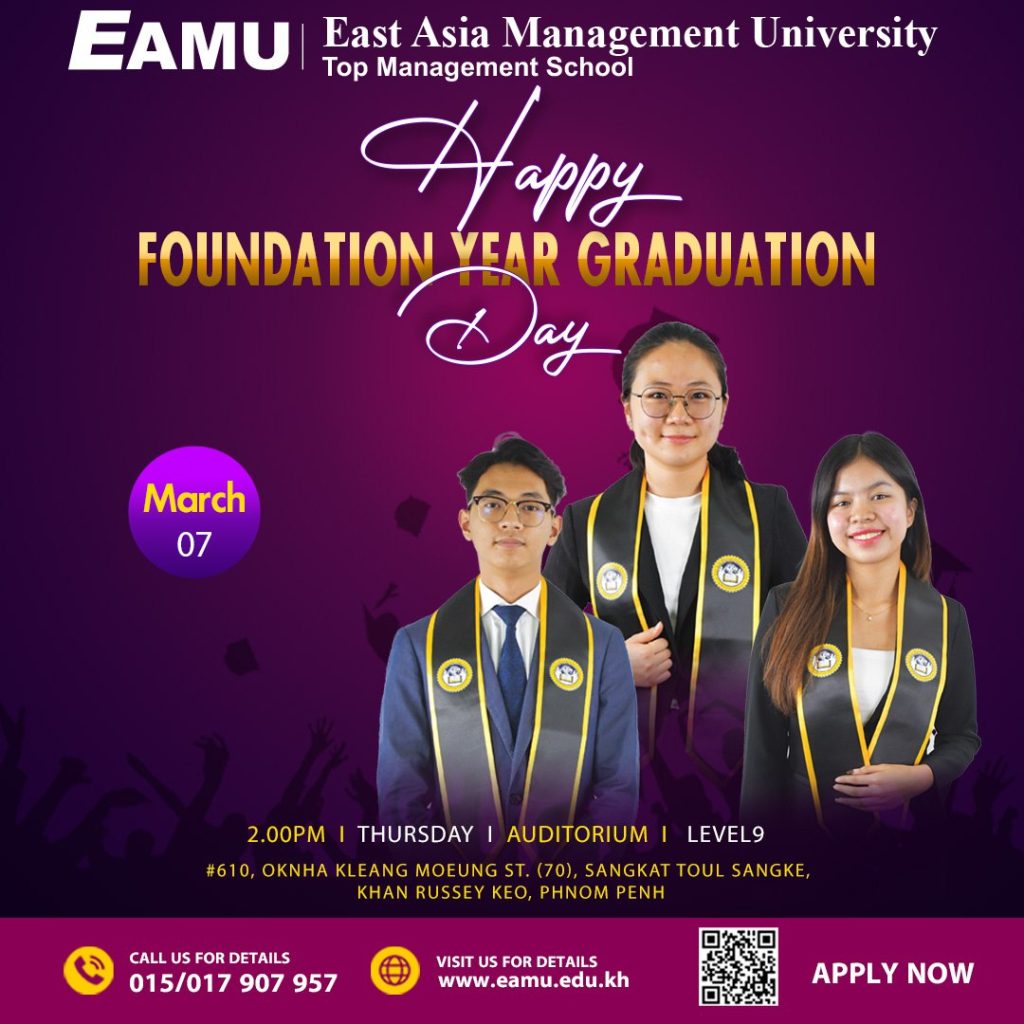 East Asia Management University (EAMU) proudly celebrated the graduation of our 3rd Intake Foundation Year students on 7th March 2024. The ceremony marked a significant milestone for our graduands, who were joined by their families, friends, faculty members, and fellow students in a joyous and memorable occasion. 📅 Date: 7th March 2024📍 Location: East Asia Management University (EAMU), Phnom Penh The event was graced by our Guest of Honour, officials from the Accreditation Committee of Cambodia (ACC), members of the EAMU Board of Governors and Academic Board, teaching faculty, parents, and distinguished guests. Their presence highlighted the importance of this celebration and added to the pride and joy of the day. The graduation ceremony was not only a recognition of the students’ hard work and achievements but also a reflection of EAMU’s commitment to nurturing talent and preparing students for academic success and future professional pathways. EAMU extends our heartfelt appreciation to everyone who attended and supported this special event. Together, we look forward to seeing our graduates continue their journey of growth, learning, and success.